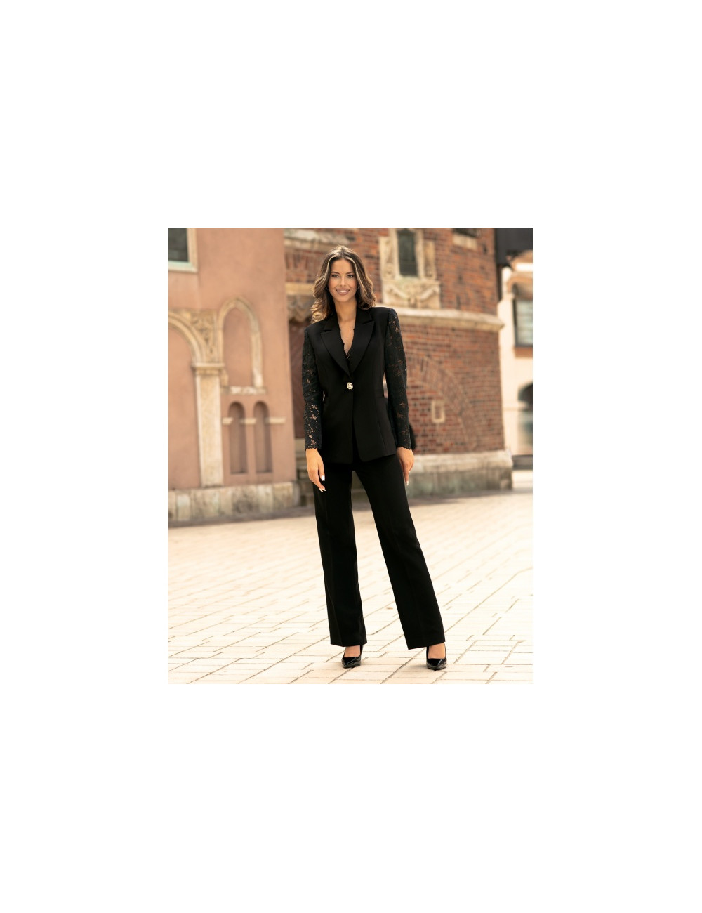 Cameron to propozycja czarnego garnituru damskiego z koronkowym rękawem. Żakiet jest dopasowany i zapinany na złoty guzik. Spodnie proste i klasyczne , zapinane na zamek.