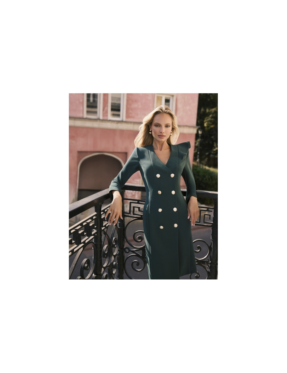 Beth to propozycja eleganckiej, marynarkowej sukienki w kolorze butelkowej zieleni. Model ma długi rękaw z ozdobnymi guzikami oraz modelujące cięcia na plecach. Sukienka ma dwurzędowe zapięcie z ozdobnymi, złotymi guzikami oraz ozdobę na ramieniu.