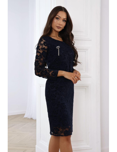 Karina to propozycja szykownej sukienki uszytej z elastycznej koronki w eleganckim granatowym kolorze. Góra sukienki w formie narzutki oraz dół tworzą całość i są podszyte wiskozową podszewką. Rękawy w długości 7/8 są przezroczyste co nadaje sukience dodatkowego szyku.